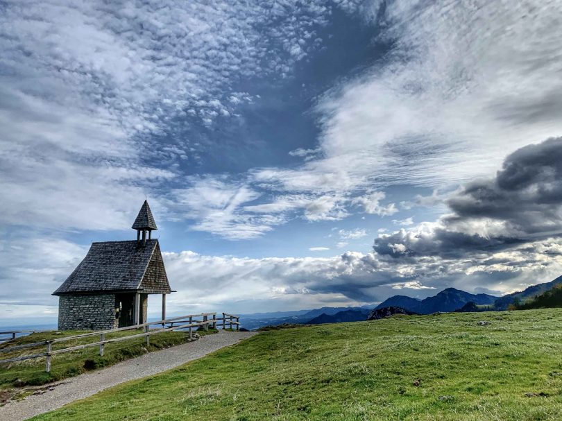In den frühen Morgenstunden ist es noch ganz ruhig im Kampenwandgebiet. Der Herbst bringt es mit sich, dass Nebel und kühlere Temperaturen Einzug halten. Was für eine Anmut zeigt sich östlich der Steinlingalm mit der Gedächtniskapelle „Maria, Königin des Friedens“. Dicke Regenwolken ziehen ab und der Kraftort erscheint dabei plötzlich aus dem Nichts. Das strahlende Licht der Sonne bringt Wärme und wohlwollende Momente. Diese wunderbare Jahreszeit steht nicht nur für Genuss für Leib und Seele sondern auf für ganz besondere Augenblicke.