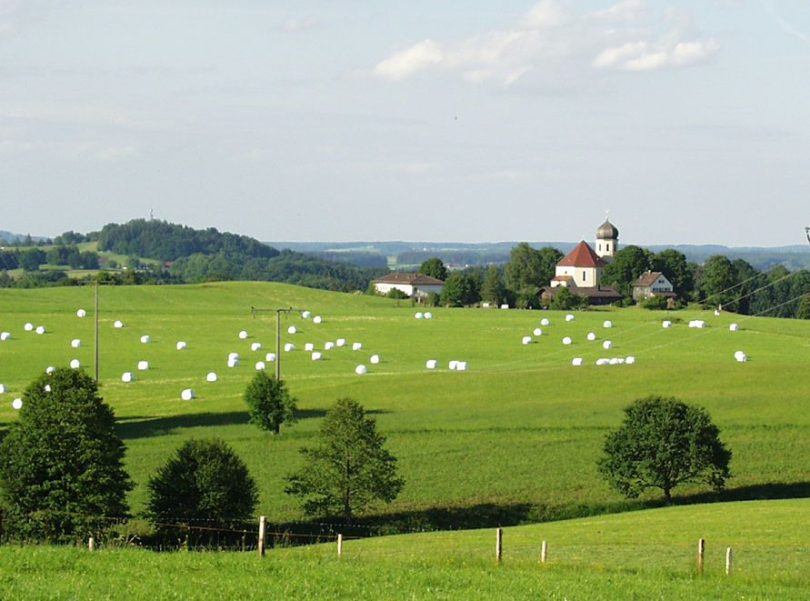 Foto: Hötzelsperger – Blick mit vielen Siloballen auf die Kirche Wildenwart
