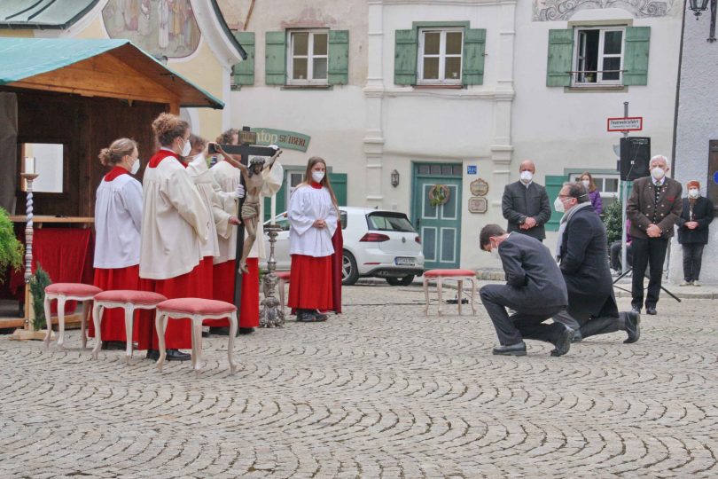 Die Verantwortlichen zusammen mit Pfarrer Christoph Rudolph haben vor allem für die Kinder das Ostergeschehen in Neubeuern eindrucksvoll an verschiedenen Station vorbereitet. Mit Gebetszetteln, kleinen Gaben, Kerzen waren die Stationen ausgestattet. Ein Bibeltext beschrieb das Geschehen, so an einem Feldkreuz, wo zu Fronleichnam der Altar aufgebaut ist oder an der Ölbergkapelle am Friedhof oder am Tisch beim letzten Abendmahl aufgebaut vor der Leichenhalle sowie beim Heiligen Grab in der Kirche von Altenbeuern. Im Familienverbund konnten die einzelnen Stationen besucht werden. So war auch ein enger Kontakt ausgeschlossen. Am Marktplatz waren für die Erwachsenen die Vorbereitungen getroffen worden zur Karfreitags-Liturgie. Der Altardienst mit Pfarrer Chirstoph Rudolph und eine kleine Gruppe des Kirchenchores nahmen vor dem Kriegerdenkmal Aufstellung, die überschaubare Kirchengemeinde fand sich auf dem weiten Rund am unteren Marktplatz und um den Marktbrunnen ein. Stellvertretend für die Kirchenbesucher nahmen während der Messfeier Vertretrer von Kirchenverwaltung und Pfarrgemeinderat sowie Lektoren und der Altardienst die Kreuzverehrung vor. Das Kreuz blieb auch nach dem Gottesdienst im Altarbereich zur persönlichen Verehrung.