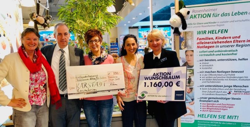 Bei Karstadt in Rosenheim wurde in der Adventszeit großes soziales Engagement gezeigt. Die Kunden von Karstadt spendeten mit viel Herz bei der Aktion „Gutes tun mit einem Stern vom Weihnachtsbaum“ insgesamt 1.160 Euro Gutscheinkarten für Kinder und Familien in Not in der Rosenheimer Region. Weitere 890 Euro an Spende konnten an den Adventssamstagen an der sozialen Skihütte mit Getränken und Lebkuchen erwirtschaftet werden. Die Vorstandschaft der Rosenheimer Aktion für das Leben e.V. hatte an diesen Nachmittagen über die Arbeit des Vereins informiert und konnte vielen Kundinnen und Kunden einen Einblick in diese wichtige Unterstützungsleistung geben. Bei der Übergabe der Spenden in Höhe von 2.050 Euro bedankten sich (von links) die Geschäftsführerin der Rosenheimer Aktion Brigitte Plank, Schatzmeister Hans-Peter Maier, die stellvertretende Vorsitzende Ulrike Plankl sowie die erste Vorsitzende Christine Domek-Rußwurm bei der Filialgeschäftsführerin Regine Mickley für die großartige Unterstützung des Teams von Karstadt.