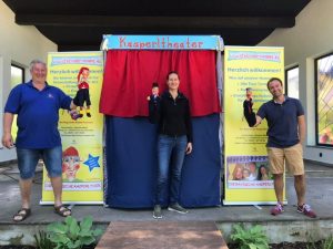 Das Chiemsee Kasperltheater sorgte mit Abstand und zwei gut besuchten Vorstellungen im Bernauer Kurpark für gute Laune: von links nach rechts: Chiemsee-Kasperl Stephan Mikat, Bürgermeisterin Irene Biebl-Daiber und Christoph Osterhammer, Leiter der Touristinfo.