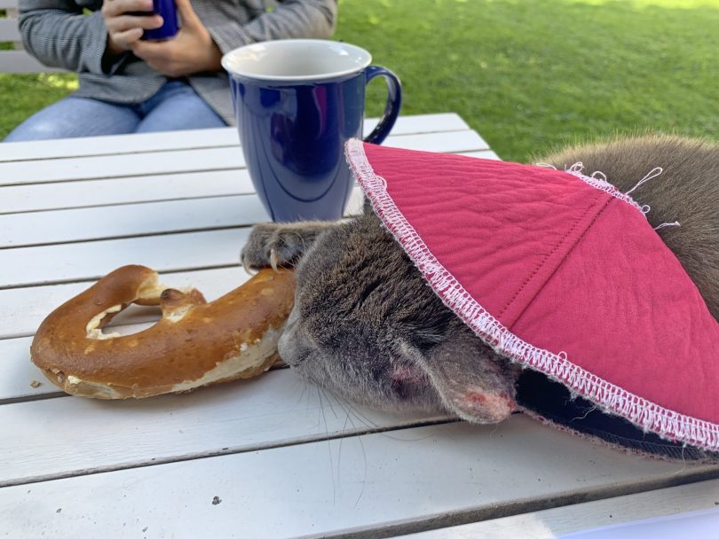 Einen Moment nicht aufgepasst und die Frühstücksbreze ist weg – so wie in einem Neubeurer Garten als die Katze Cleopatra einen Moment des Wegschauens von ihrem Frauchen nutzte und schon schnappte sie das Brezenstück und eilte über die Wiese hinweg zu einem gemütlichen Picknick.