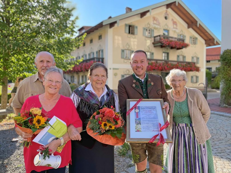 Seit 60 Jahren vermietet Hildegard Kirner Zimmer auf dem Keilhof im Herzen von Aschau, in Nachbarschaft der Kirche. Doch nicht nur das Jubiläum der Vermieterin sollte gefeiert werden, auch die Treue der Familie Heep wurde gewürdigt. Zum 35 Mal sind sie nun schon in Aschau i.Chiemgau zu Gast bei Frau Kirner. Bei diesen zwei besonderen Anlässen ließ es sich der Tourismuschef Herbert Reiter (zweiter v. re.) nicht nehmen und überreichte zum Jubiläum Ehrenurkunden und Blumen dem Keilhof. Norbert und Marlene Heep (li) erhielten neben den Blumen und der Ehrenurkunde noch einen Aschau-Krug. Antonia Kirner (re) freute sich für ihre Schwägerin Hildegard Kirner (zweite v. li) über die besondere Auszeichnung der treuen Vermietung seit 60 Jahren.