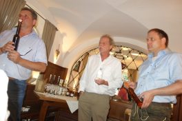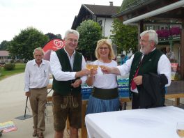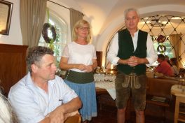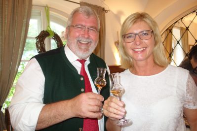 Die interessante Schnapsgeschichte hatte einen ernsten Hintergrund. Auch in Bayern endet auf EU-Veranlassung das Branntwein-Monopol, gerade für die Kleinbrenner ändern sich die wirtschaftlichen Rahmenbedingungen, es wird erwartet, dass eine Vielzahl der in Deutschland registrierten 20.000 Kleinbrenner aufhört. In Bayern hat der Verein der Bayerischen Edelbrandsommeliers aufgerufen, nicht zu resignieren, sondern auf Qualität zu setzen. Und in diesem Zusammenhang kamen die Edelbrenner auf die Idee, an ausgewählten Orten Bayerns ein Jahr lang ein 50-Liter-Eichenfass mit jeweils gleichem Zwetschgenbrand gefüllt zu lagern und abzuwarten, was die unterschiedlichen Lagerorte für Einflüsse auf die Qualitätsentwicklung und auf den Reifeprozess haben. Die sechs Orte sind auf dem Kreuzberg in der fränkischen Rhön, im Weinkeller von Veitshöchheim, in der Teufelshöhle von Pottenstein,, in der Schatzkammer von Burghausen, auf der MS Bayern auf dem Bodensee und eben beim Klosterwirt auf der Fraueninsel. Benedikt Pointner als Vorsitzender der Bayerischen Edelbrandsommeliers sagte bei der Rückholung des ersten Fasses und nach dem Anstich bei der ersten Kostprobe der bernsteinfarbenen Köstlichkeit: „Der ist eine Wucht!“. Alle sechs Fässerinhalte sollen nunmehr zusammengeführt werden, so dass ein in ganz Bayern einmaliger  Brand entstehen wird. Die Botschaft soll letztlich nicht nur der Genuss sein, sondern auch das Bewußtsein, dass Sommeliers frei von Chemie, Aromastoffen und Fehlern herstellen. „Das Ende des Monopols bedeutet nicht Endzeit-Stimmung, sondern eine Chance“, so Benedikt Pointner, der dabei von Bayerns Verbraucherschutz-Ministerin Ulrike Scharf starke Unterstützung erhielt. Die Ministerin sagte: „Edelbrandsommeliers sind Botschafter des geistigen Genusses, bei denen Geradlinigkeit und Unverfälschtheit hoch im Kurs stehen und die sich große Verdienste um den Erhalt der Streuobstwiesen und der bayerischen Kulturlandschaft erwerben“. Bei der Edelbrand-Aktion auf der Fraueninsel waren auch der Vorsitzende des Südostbayerischen Brennerverbandes Andreas Franzl, der Brennereibeauftragte an der Landesanstalt für Wein- und Gartenbau in Veitshöchheim Mathias Krönert, Bezirksrat Sebastian Friesinger als Vorsitzender des Vereins zur Förderung der Regionalentwicklung im Raum Rosenheim sowie einige Edelbrandsommeliers aus Oberbayern dabei. Sie stellten beim mehrgängigen Abendessen mit Chiemsee-Renke im Klostercafe die individuellen Vorzüge ihrer Brände vor. Hernach machte sich die gesamte Schnaps-Runde noch auf den Weg rund um die Fraueninsel, das 50-Liter-Fass auf einem Leiterwagen heimziehend und mit der Schnaps-Musi der Familie Schauer aus Wackersberg-Schnegg als musikalische Begleiter. In Gstadt angekommen, wurde das Fass gut verstaut und so endete die Rundreise dort wo sie ein paar Stunden zuvor begonnen hatte: mit einem Cocktail-Empfang namens Ghostrider, der Himbeergeist, Zitronensaft, Ingwersirup, Eis, Kombucha, Himbeerfrucht und Melissenzweig zum Inhalt hatte –  wie allseits bestätigt: auch eine gute „Schnaps-Idee“.