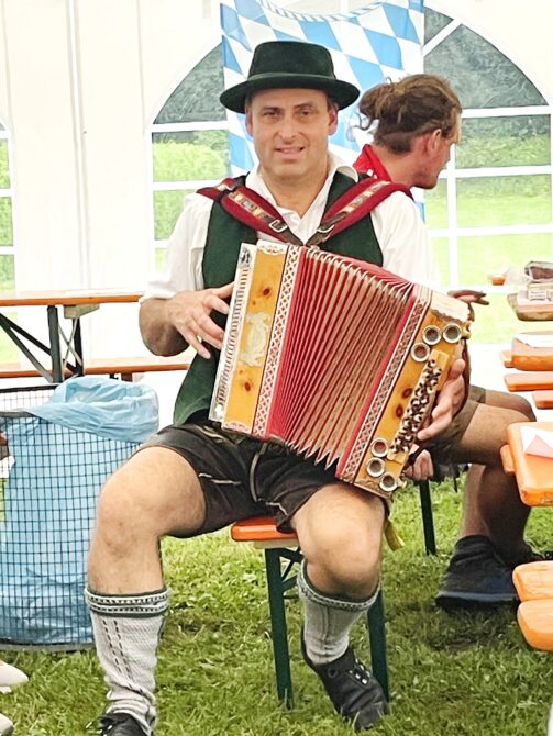 Fotos: Hötzelsperger – Eindrücke vom bayerisch-tirolerischen Hufeisenturnier in Prien-Kaltenbach – 1. Siegermannschaft von links: Hans Leitner, Matthias Riedmann, Josef Riedmann und Adi Streif (85 Jahre). 2. Vorstand Josef Freund (li.) und Manfred Zott bei der Siegerehrung 3. Paul Bertl, Musikant aus Bergen. 3. Ehrenvorstand Peter Freund (re.) mit Baron Ludwig von Cramer-Klett auf dem Turnierplatz vor dem kleinen Festzelt.