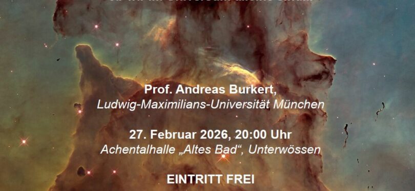 Am Freitag, 27. Februar um 20 Uhr hält Professor Andreas Burkerd von der Ludwig-Maximilians-Universität einen öffentlichen Abendvortrag im Rahmen des 55. Schlechinger Arbeitstreffen der Kernphysiker. Es geht um die Frage „Urknall, Sternenstaub und die Frage nach dem Leben“. Der Abend fasst die aktuellen wissenschaftlichen Erkenntnisse zusammen und diskutiert die spannende Frage, ob wir im Universum alleine sind.