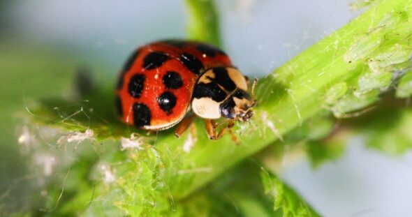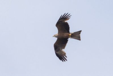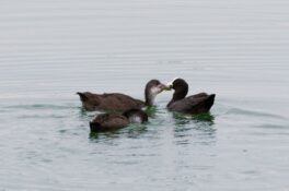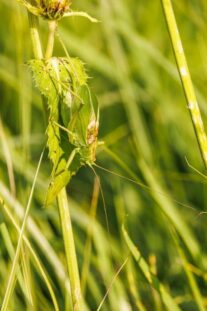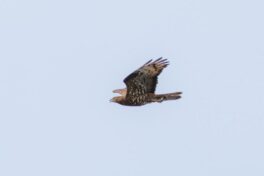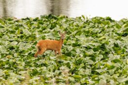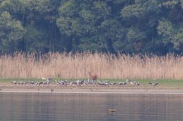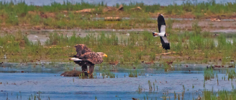 Die nun deutlich kühleren Julitage nutze ich für einige Ausflüge in die Hirschauer Bucht und an den Grundlossee. Ein lokal begrenzter Hagel hatte offensichtlich den Libellenbestand am Grundloser See weitgehend vernichtet und die Blätter der Zwergseerosen heftig perforiert. Doch zahlreiche Heuschreckenarten, Perlmutterfalter und asiatische Marienkäfer bei der Blattlausmahlzeit boten noch schöne Fotomotive. Die Weiterfahrt an die Hirschauer Bucht wurde mit außergewöhnlichen Fotoerlebnissen belohnt. Ein Wespenbussard brachte ein ausgegrabenes Wespennest zum Horst, Amsel und Bachstelzen ernteten wohl hunderte frischgeschlüpfte Libellen als Futter für ihre Jungen im Nest. Der Seeadler landete inmitten zahlreicher Limikolen, die völlig unbeeindruckt weiter nach Nahrung im Schlick stocherten. Nur ein Kiebitz attackierte den großen Greif mit spektakulären Überflügen. Eine Hirschkuh überraschte die am Ufer ruhenden Graugänse, die aufgeregt ins Wasser flüchteten. Auf der Suche nach neuen Nahrungsquellen wagte sich ein Reh weit in das ausgedehnte Teichrosenfeld und ein Schwarzmilan mit Resten einer Ringelnatter in den Fängen überflog die Bucht. Eine Bekassine nutzte zur Bessern Übersicht eine erhöhte Sitzwarte, während eine Stockente ihre Kinderschar auf einer Totholzinsel zur Mittagsruhe versammelte und die Kolbenente ihre große Kinderschar in die sichere Deckung des Teichrosenfeldes führte. Schon fast erwachsene BlesshuhnKüken wurden von den Eltern mit Wasserpestblättern gefüttert.