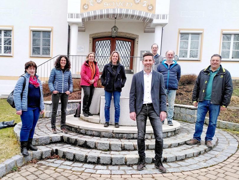 Bericht: LRA Rosenheim – Foto: Margit Böhm – Von links nach rechts: Emma Maier Landwirtin, Christine Böhm Umweltreferentin Gemeinde Soyen, Margit Böhm von der untere Naturschutzbehörde Landratsamt Rosenheim, Andrea Voglmaier Wiesenbrüterberaterin, Bürgermeister Thomas Weber, Jakob Singer Landwirt, Johann Fleidl Landwirt, Johann Kneißl Landwirt. Auf dem Foto fehlt Landwirt Sebastian Ramm.