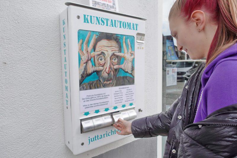 Kann man Kunst aus einem Automaten ziehen? Ja, in Kiefersfelden ist das tatsächlich möglich. Seit drei Jahren gibt es dort in der Dorfstraße 30 den sogenannten „Kunstautomaten“. Man wirft vier Euro ein und zieht dann ein Fach heraus. Die Spannung steigt und am Schluss hält man dann eine Miniatur-Skulptur, ein kleines Gemälde oder sogar „Bayern in der Box“ in seinen Händen.