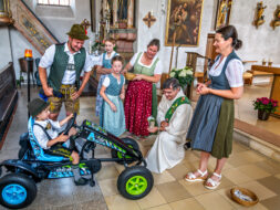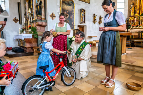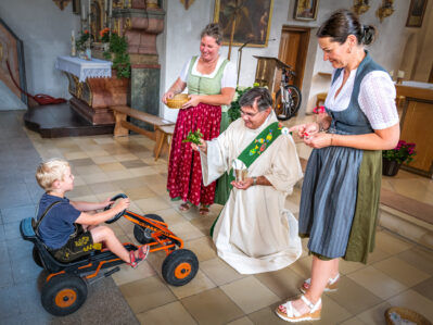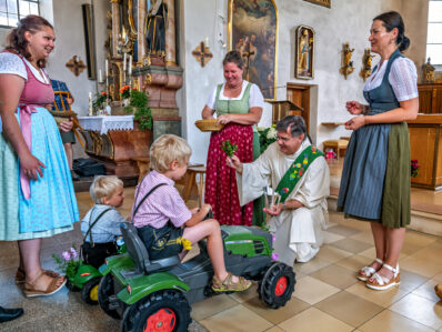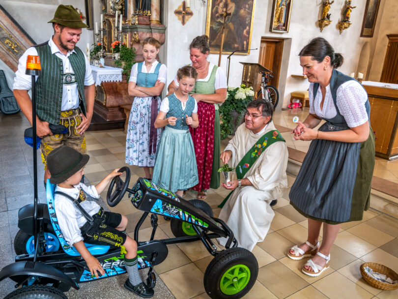 Sehr gut angenommen wurde in der schön geschmückten Pfarrkirche „Mariä Himmelfahrt“ in Törwang auf dem Samerberg ein von Diakon Günter Schmitzberger gefeierter Familiengottesdienst. Viele der Kinder brachten ihre geliebten Spielfahrzeuge mit, von Fahrrädern und Rollern bis hin zu bunten Dreirädern und kleinen Autos. Diakon Schmitzberger betonte, wie wichtig es sei, die alltäglichen Wege und Reisen der Gemeindemitglieder unter den Schutz Gottes zu stellen und seine Fürsorge zu erbitten.