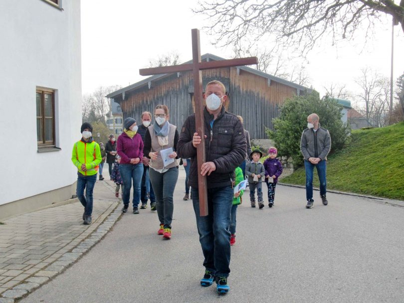 Einen eigenen Kreuzweg zu verschiedenen Stationen hat die Pfarrgemeinde „Christkönig“ von Wildenwart (Pfarrverband Westliches Chiemseeufer) am Karfreitag eingerichtet. Jugendliche, Erwachsene und Familien waren den ganzen Tag eingeladen, die Kreuzwegstationen aufzusuchen und sich selbst und individuell auf den Weg zu machen. Gemeinsam zum Auftakt des Tages unterwegs waren auf Einladung des Familien-Gottesdienst-Teams Kinder mit ihren Eltern und Großeltern. An allen Marterl und Gebetsstationen konnten sich die Kinder jeweils einen kleinen Stein mitnehmen und damit ihre Pilger-Säckchen füllen.