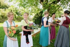 Übergabe von Blumensträußen an Regina Häußler, Vroni Weinhart und Steffi Perfler durch die beiden Gaujugendleiterinnen Barbara Sigl und Maria Voglsinger (v.l.n.r: Häußler, Weinhart, Sigl, Perfler, Voglsinger)