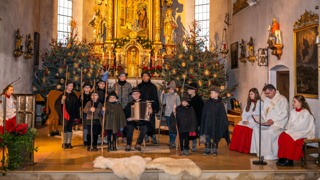 Ein weiterer Höhepunkt der Kinderchristmette war der Auftritt des Kinderchors unter der Leitung von Genoveva Schwarz, der als Engelchor auftrat. Die kleinen Sängerinnen und Sänger verzauberten die Gemeinde mit ihren klaren Stimmen und trugen dazu bei, die Botschaft der Weihnacht auf eine kindgerechte und zugleich berührende Weise zu präsentieren. Die Hirtenkinder, unter der einfühlsamen Leitung von Monika Bauer, führten eine bezaubernde Darbietung auf. Ihre Aufführung erzählte auf charmante Weise die Geschichte der Hirten auf dem Feld, die von der Geburt Jesu erfuhren. Die Kinder imitierten die Hirten mit großer Hingabe und trugen so zur lebendigen Inszenierung der Weihnachtsgeschichte bei.