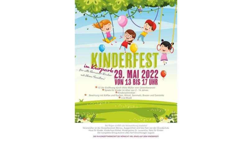 Am 29. Mai findet im Kurpark in Bernau von 13 bis 17 Uhr wieder das Kinderfest statt. Beteiligt sind die Bernauer Kindergärten und die Grundschule. Der Erlös kommt allen fünf Einrichtungen zugute!