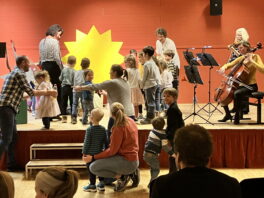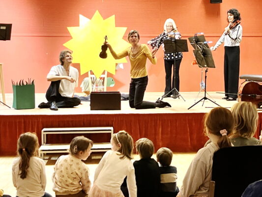 Schließlich löste die weise Schildkröte das Rätsel: Es war eine Sonnenfinsternis. In der plötzlich stillen Dunkelheit intonierte das Ensemble das Lied „Der Mond ist aufgegangen“ und alle durften mitsingen. Als das Licht zurückkehrte, durften die Kinder zum Menuett aus dem Notenbüchlein von Johann Sebastian Bach’s Frau Anna Magdalena Bach um die strahlende Sonne tanzen.