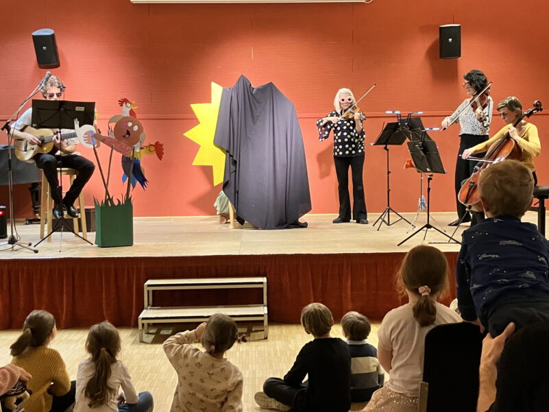 Erzähler Thorsten Köpke lieh den Tieren seine Stimme, sang und begleitete sich und die Kinder dabei immer wieder auf der Gitarre. Das Ensemble „Tre Donne“ mit Dorothea Biehler (Violine), Gül Pluhar (Viola) und Katja Labbow (Violoncello) nahmen die Kinder mit auf ein musikalisches Abenteuer, in dem Henne, Hahn, Ente, Schwein und Ziege plötzlich glauben, jemand würde die Sonne fressen.