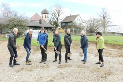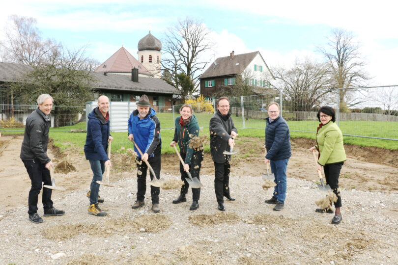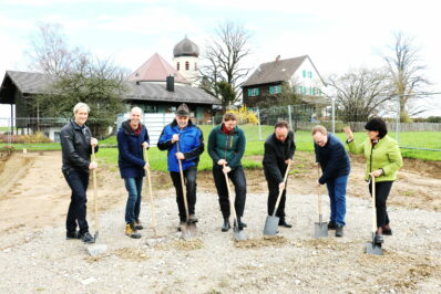 Bericht und Bilder:  Heinrich Rehberg – Erster Spatenstich für den Neubau der gemeinsamen Kindertagesstätte der Gemeinde Frasdorf und der Marktgemeinde Prien in Wildenwart  (von links) Martin Karl, Landschaftsarchitekt vom Büro Grünwerk Landschaftsarchitekten aus Bad Aibling – Olaf Hoffmeyer, Bauamtsleiter Gemeinde Frasdorf – Thomas Bachmann, Ingenieurbüro Höllige-Wind aus Anger – Svenja Rohde, Architektin vom Planungsbüro Firmhofer + Günther Architekten aus München – Bürgermeister Daniel Mair, Gemeinde Frasdorf – Bürgermeister Andreas Friedrich, Marktgemeinde Prien, Rosi Hell, Gemeinderätin Prien