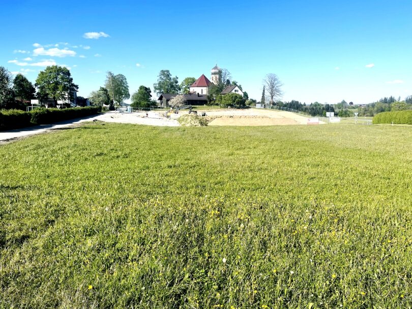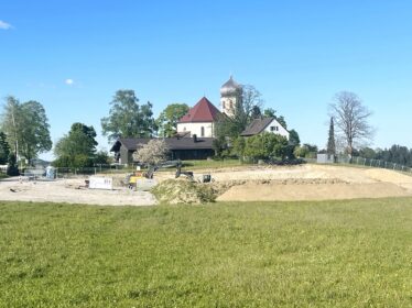 Gut voran kommen die Bauarbeiten für die Kindertageseinrichtung in Wildenwart. Eingebettet zwischen Kirche und Pfarrheim einerseits sowie Musikantenheim, Schule und Spielplatz andererseits bekommen die Kinder und die mit der Einrichtung Beschäftigten eine vorzügliche Lage.