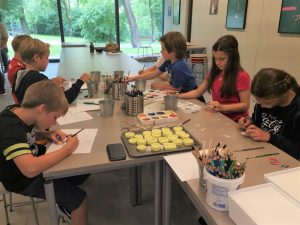 Paul (vorne links) bastelt mit seinen Freunden bei seiner Geburtstagsfeier fleißig Ammoniten.