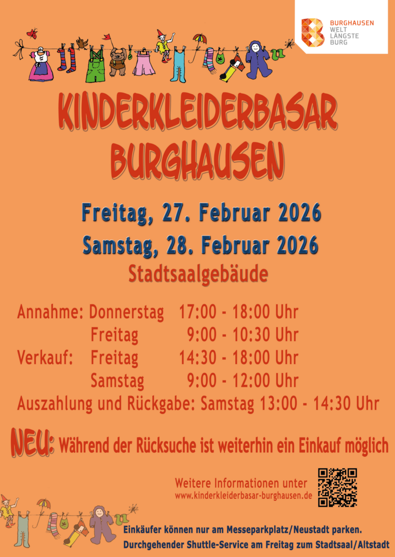 Die Stadt Burghausen veranstaltet von Donnerstag, 26. Februar, bis Samstag, 28. Februar, die Frühjahrsausgabe des Kinderkleiderbasars im Stadtsaal Burghausen (Altstadt). Der Basar bietet Familien die Möglichkeit, gut erhaltene Kinderkleidung, Schuhe, Spielwaren und Zubehör zu verkaufen und preisgünstig einzukaufen. Mit dem Kinderkleiderbasar verbindet die Stadt Burghausen nachhaltiges Handeln mit sozialem Engagement und Unterstützung für Familien.
