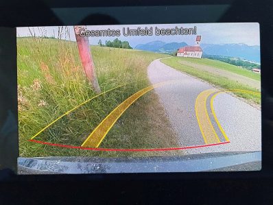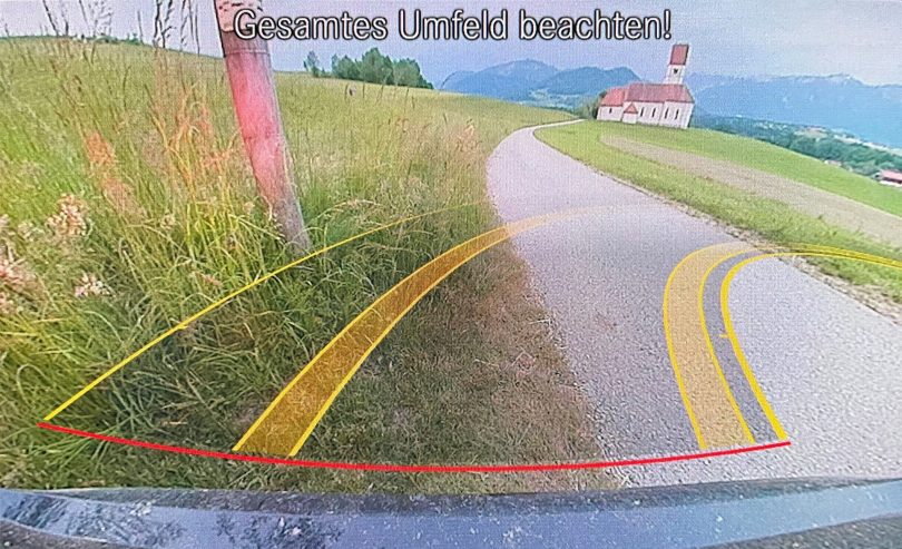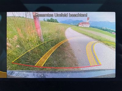 Dieses Foto zeigt die Wallfahrtskirche St. Florian bei Frasdorf und ist durch die Rückfahrkamera im Auto entstanden. Passend zu schönen Landschaft mit Kirchenblick trägt es den aussagekräftigen Titel “Gesamtes Umfeld beachten”.