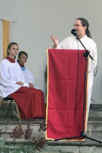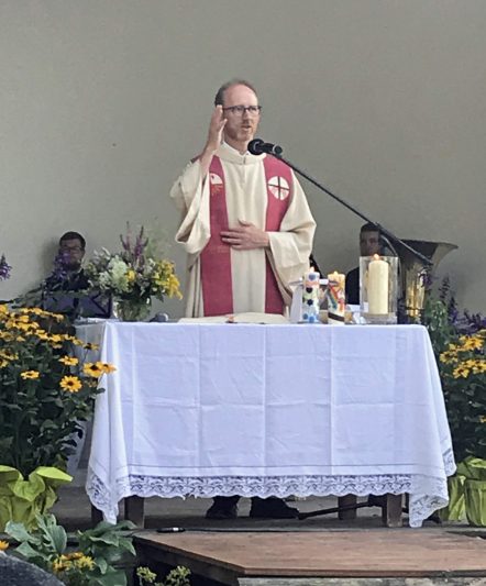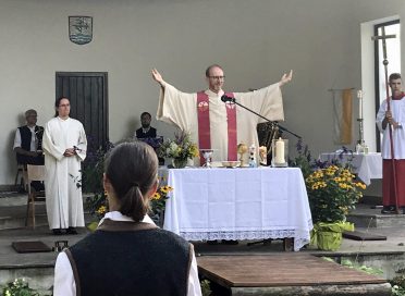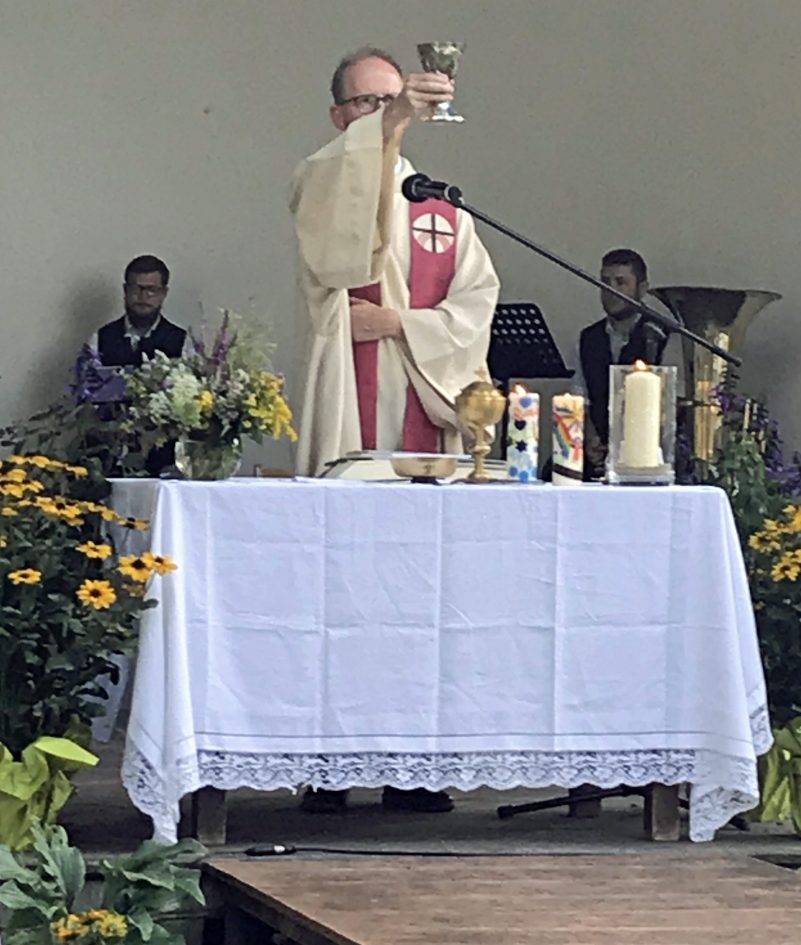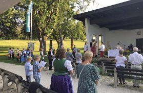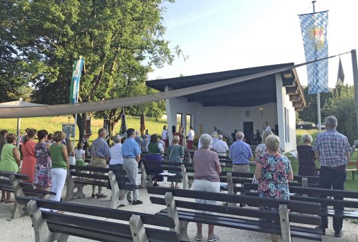 Mehrere Fahnenabordnungen und ein geschmückter Altarbereich sorgten abends für eine feierliche Atmosphäre, als Pfarrer Klaus Hofstetter und Gemeindeleiterin Conny Gaiser mit den Ministranten den Pavillon im Bernauer Kurpark betraten.