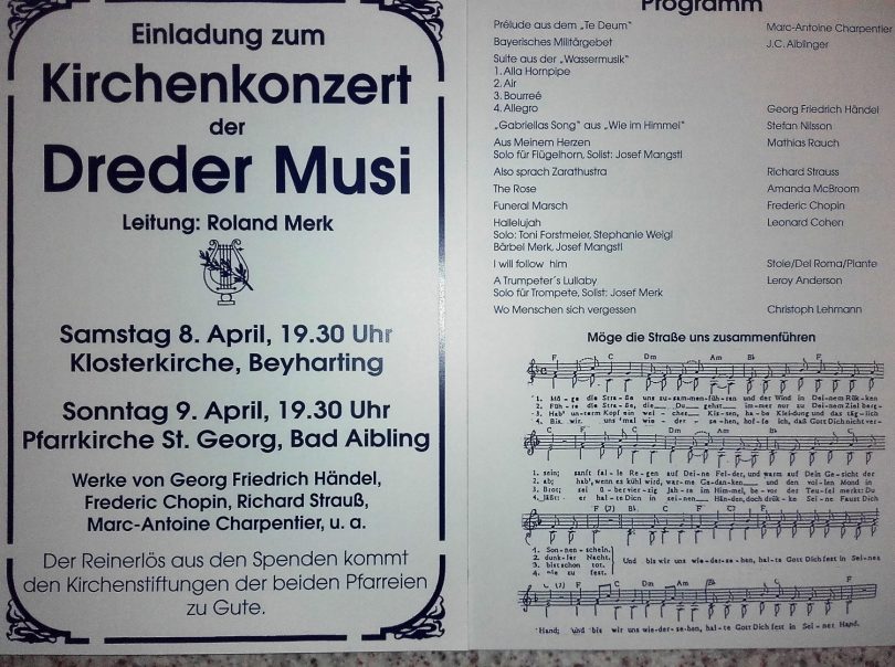 Die Dreder Musi bietet am Palmsamstag, 8. April in der Klosterkirche in Beyharting und am Palsonntag, 9. April in der St. Georgskirche in Bad Aibling jeweils um 19:30 Uhr Kirchenkonzerte an.