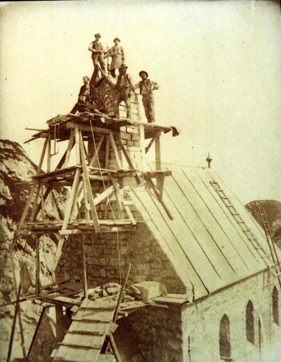Archivfoto Bauphase 1889: Vor 130 Jahren wurde auf der sog. Schwaigerwand am Wendelstein der Grundstein für die nach wie vor höchst gelegene Kirche Deutschlands gelegt.
