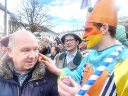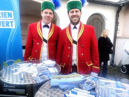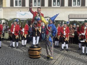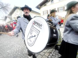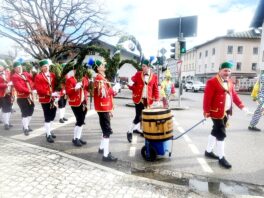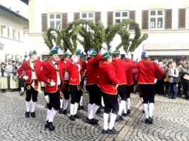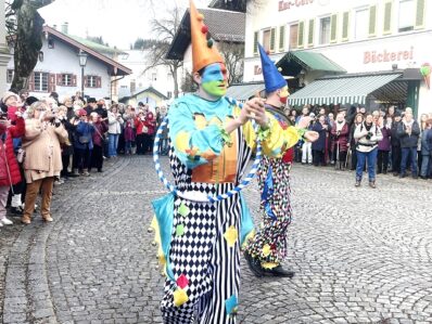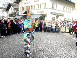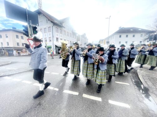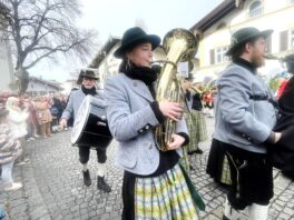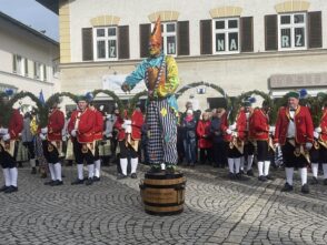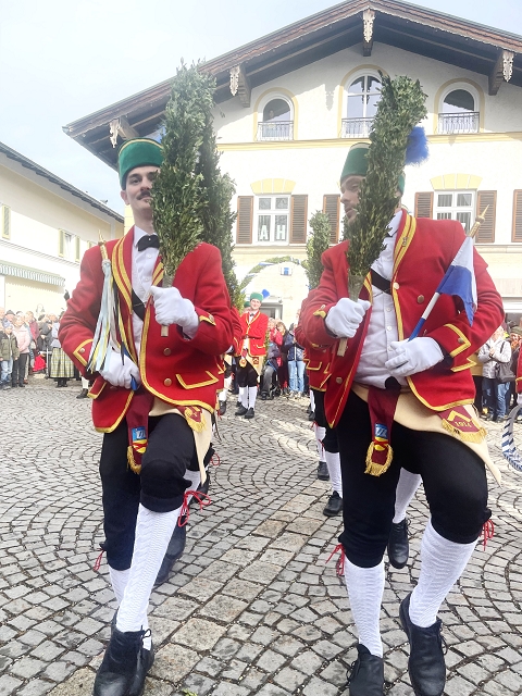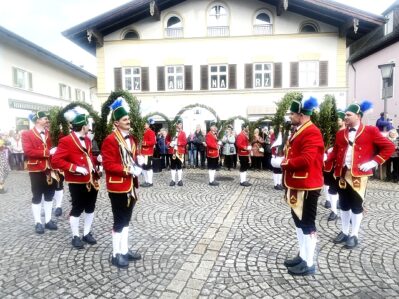 Musikalisch begleitet wurden die Schäffler von der Musikkapelle Kirchheim, eine große Anzahl von Zuschauern auf dem Priener Marktpatz zeigte sich begeistert von den Musikanten, Tänzern, Kasperln und Reifenschwingern beim etwa halbstündigen Auftritt.