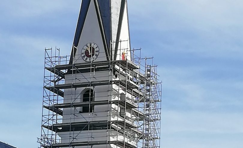 Bericht und Foto: Der Frasdorfer Kirchturm, eingerüstet für die ersten Ausbaumaßnahmen