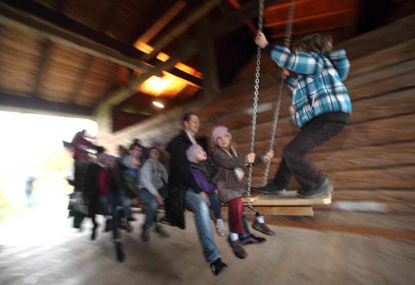 BHM_Kirtahutschn.jpg: Ein beliebtes Vergnügen ist das gemeinsame „Kirtahutschn“ im Holzmannhof. © Bezirk Oberbayern, Archiv BHM Amerang (G. Nixdorf).