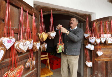 BHM_Kirchweih_003.jpg: Für jeden das passende Herzerl: Die Lebkuchen sind ein beliebtes Souvenir. © Bezirk Oberbayern, Archiv Bauernhausmuseum Amerang, Aufnahme: Gerhard Nixdorf.