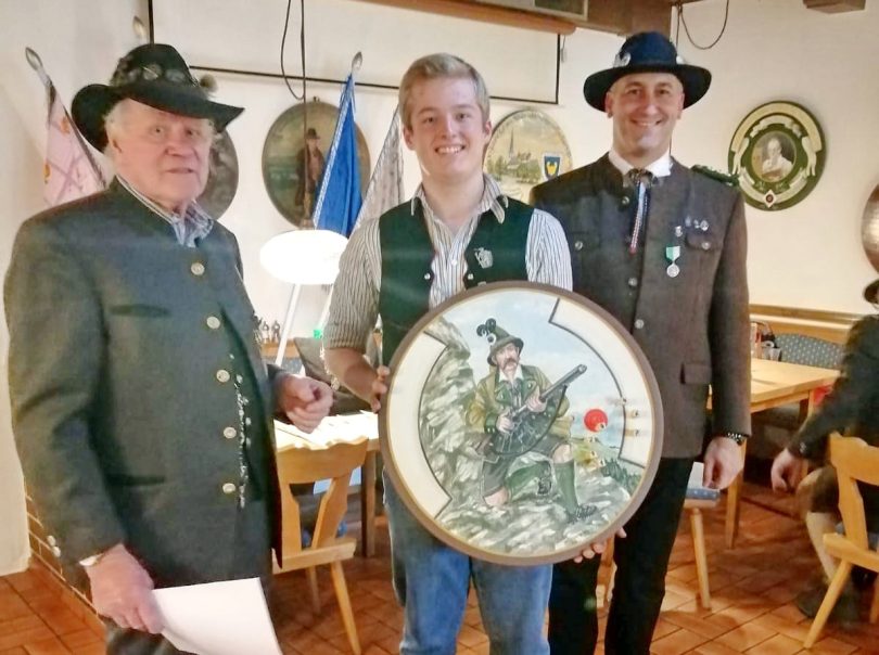 Foto: FSG von links – Walter Strauß ( Organisator Kirchweihschießen), Kilian Fichtl ( Gewinner Kirchweihscheibe), Florian Wunderle (1. Schützenmeister FSG Prien)