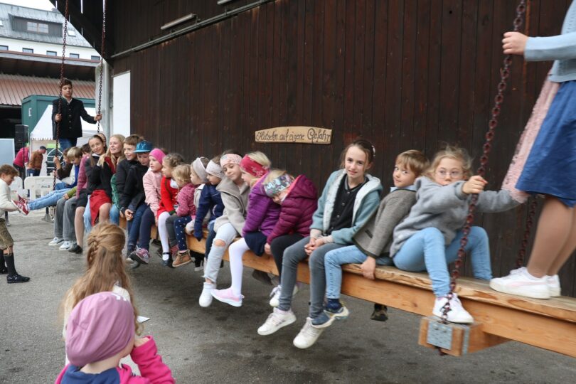 Kirtahutschn – ein himmlisches Vergnügen. Der Trachtenverein Niederaschau lud in Aschau zum Hutschn ein, die Kleinen lassen es noch ein bisschen vorsichtig angehen, die Großen fliegen mit der Kirtahutsch direkt in den Himmel. Die Gaudi ist riesengroß bei dem wilden Ritt – muss man sich doch beim Vordermann gut festhalten. Die Kirtahutsch ist einmaliges Vergnügen und das gibt’s nur ein einziges Mal im Jahr. Ein paar lange Ketten, ein dicker Laden unter dem Scheunenvordach und darauf ein Haufen Kinder – fertig ist das Vergnügen. Aber auch die Erwachsenen hatten ihren Spaß. Schulkinder, junge und junggebliebene Leute freuten sich schon seit langem auf dieses kostenlose Vergnügen am Kirchweihsonntag. Auf dem Daurer-Hof in Haindorf trafen sich die Aschauer Kindergartenkinder, die Schulkinder und die Nachbarn und wer sonst noch alles aus der Umgebung zum Hutschn; es gab die kulinarischen Spezialitäten der Kirchweih, Auszogene, Krapfen, Kirtanudeln und ein Haferl Kaffee dazu, zur Unterhaltung spielte die Musi auf, was will man da noch mehr.