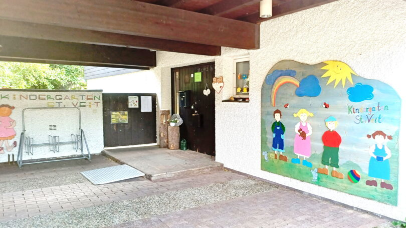 Bericht und Bilder: Christiane Giesen – Der freundlich gestaltete Eingangsbereich des Kindergartens St. Veit, für den die Elternbeiträge künftig um 20 Prozent steigen, ebenso wie für die Kinderkrippe und die Waldzwerge.