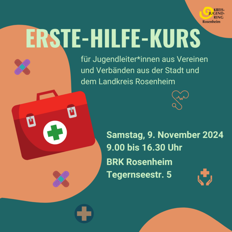 Der Kreisjugendring Rosenheim bietet in Kooperation mit dem Stadtjugendring  Rosenheim und in Zusammenarbeit mit dem BRK einen Erste-Hilfe-Kurs an. Jugendleiter*innen können diesen unter anderem zur Beantragung einer  Jugendleitercard nutzen sowie für Verlängerungsanträge.