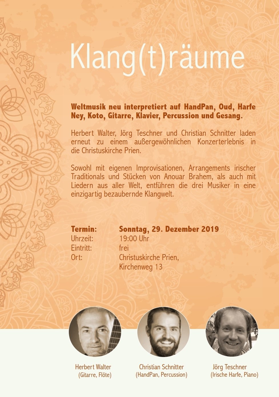 Die drei Musiker Herbert Walter, Jörg Teschner und Christian Schnitter laden am Sonntag, den 29. Dezember 2019, erneut zum Konzert “Klang(t)räume” in die evangelisch-lutherische Christuskirche Prien.