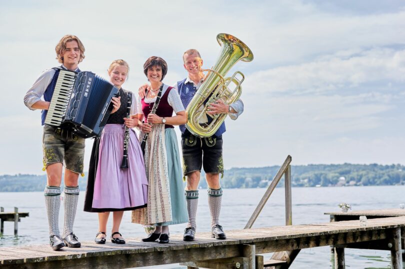 Des is a Musi: Mit Klarinetten, Akkordeon, Okarina und Tuba spielen Christian und Vroni Kellerer und ihre beiden Kinder Maria und Georg boarisch zünftig am Donnerstag, 4. Juli, von 19:00 bis 21:30 Uhr im Brunnenhof des Kurhauses Bad Aibling auf.