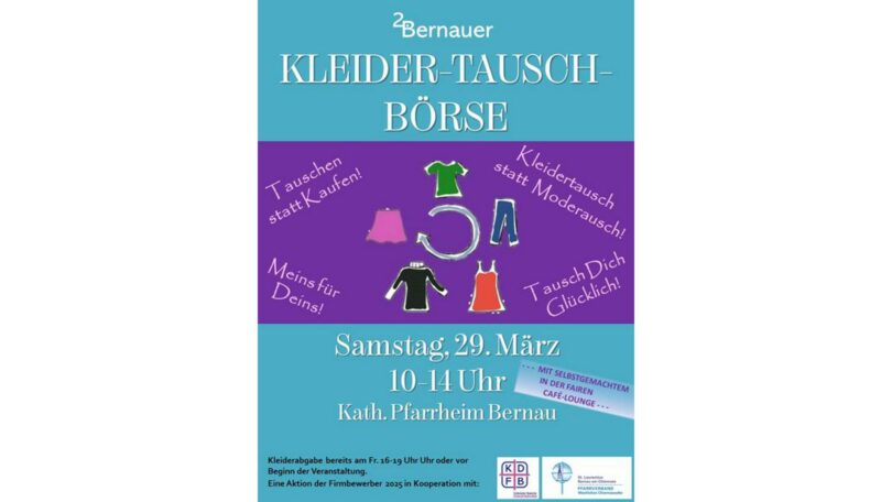 Die Firmbewerber der Gemeinde Bernau am Chiemsee laden an diesem Samstag, den 29. März 2025, von 10 bis 14 Uhr zum Kleidertausch ins katholische Pfarrheim ein.