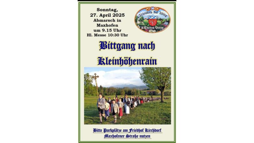 Die Trachtenvereine des Altlandkreises Bad Aibling laden am Sonntag, 27. April 2025, zum traditionellen Bittgang nach Kleinhöhenrain ein. Treffpunkt für den gemeinsamen Abmarsch ist um 9.15 Uhr in Maxhofen – im Anschluss (10.30 Uhr) feiert die Gruppe in Kleinhöhenrain die Heilige Messe.