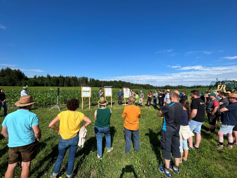 Pelham /Alteiselfing – Das Amt für Ernährung, Landwirtschaft und Forsten (AELF) Rosenheim lud zum Feldtag gewässerschonender Maisanbau auf den beiden Demonstrationsbetrieben für Gewässerschutz Josef Linner (Pelham) und Sebastian und Martin Fischer (Alteiselfing) ein. Dabei konnten sich rund 60 Landwirte und Interessierte überzeugen, wie das Mulchsaatverfahren im Mais auch bei extremen Witterungsverhältnissen funktionieren kann. Beide Betriebe haben in Zusammenarbeit mit dem AELF Rosenheim verschiedene winterharte Zwischenfruchtmischungen angebaut und diese im Frühjahr ohne den Einsatz des Pfluges eingearbeitet. Weiter wurde in die Versuchsfläche von Josef Linner kurz vor Reihenschluss des Maises eine Untersaat aus Weidelgras, Klee, Wicken und Erbsen eingesät. Das Verfahren und die Technik wurden ebenfalls am Feldtag diskutiert.
