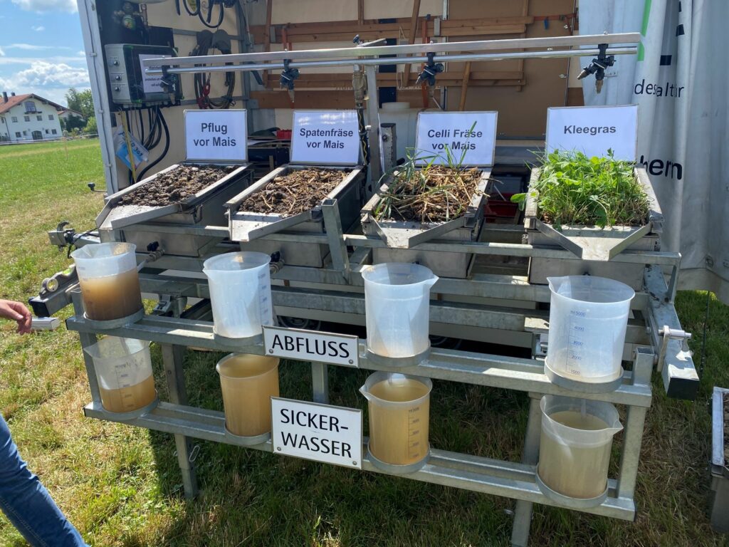 Auf dem Betrieb Fischer wurde der Regensimulator, der Landesanstalt für Landwirtschaft, vorgeführt. Dieser zeigt praxisnah, wie sich Starkregenereignisse auf unterschiedlich bewirtschafteten Böden auswirken. Hierzu wurden aus den Praxisversuchen mehrere Bodenprofile mit unterschiedlichen Bodenbearbeitungsverfahren vor Mais ausgestochen und ein Starkregenereignis von 55 Litern je Quadratmeter simuliert (siehe Foto). Es zeigte sich, dass bei der Variante mit Pflugeinsatz im Frühjahr vor Mais innerhalb kürzester Zeit die Oberfläche verschlämmte, das Wasser oberflächig abfloss und im oberen Messbecher samt der anhaftenden Erde landete. Bei den Mulchsaatverfahren mit den Bodenbearbeitungsvarianten Spatenfräse und Celli Fräse konnte das Wasser als Sickerwasser in den Boden infiltrieren und floss nicht oberflächig ab. Damit kann effektiv, insbesondere auf hängigen Flächen, der Nährstoffaustrag aus den landwirtschaftlichen Flächen und der Nährstoffeintrag in die Oberflächengewässer verhindert werden.
