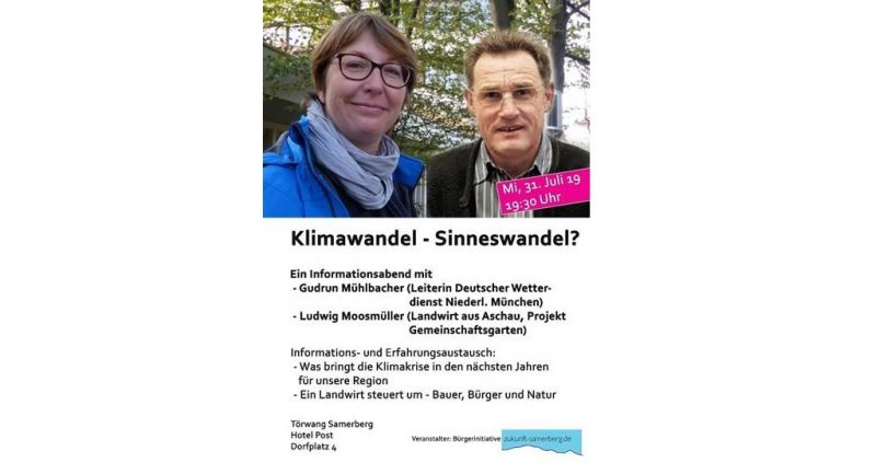 Bei der Einladung heißt es: „Wir sind sehr froh, zu diesem Thema einmal Gudrun Mühlbacher, die Leiterin der Niederlassung des Deutschen Wetterdienstes in München gewonnen zu haben. Sie beschäftigt sich insbesondere mit den Auswirkungen des Klimawandels auf unsere Region. Und zum anderen wird Ludwig Moosmüller berichten, ein Landwirt aus Aschau, der nach einem “Sinneswandel” Konzepte entwickelt hat, dem Klimawandel und anderen Herausforderungen zu begegnen. Weitere Informationen über die Arbeit der Bürgerinitiative “Zukunft Samerberg” findet man unter www.zukunft-samerberg.de.”