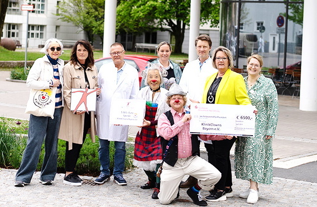 Bericht und Foto: Sparkassenstiftung Zukunft für die Stadt Rosenheim – Ein starkes Team: Vertreter des KlinikClowns Bayern e.V., der Sparkassenstiftung Zukunft für die Stadt Rosenheim, des Fördervereins der Kinderklinik e.V., des RoMed Klinikums Rosenheim sowie die Clowns Lulu und Muck bei der Spendenübergabe.