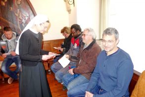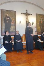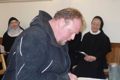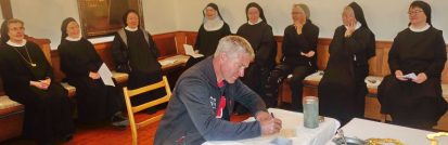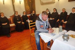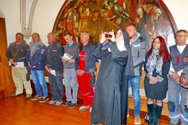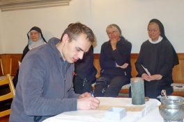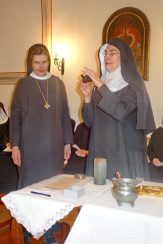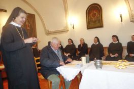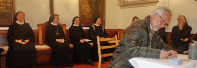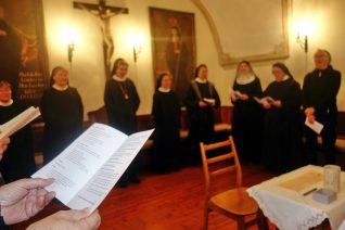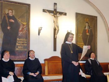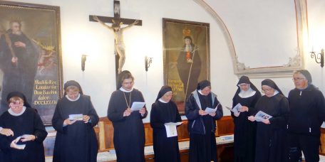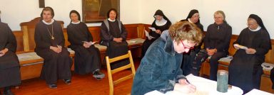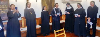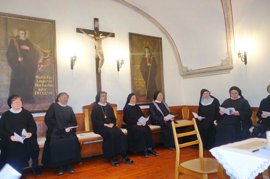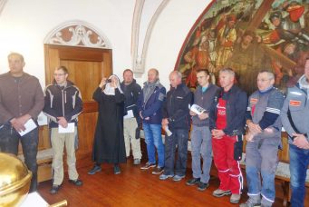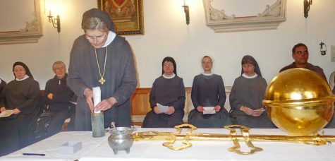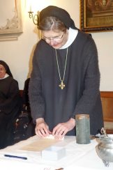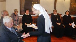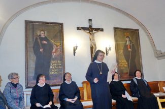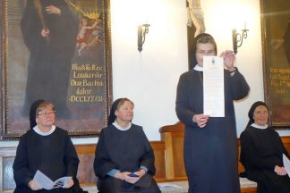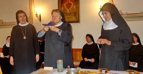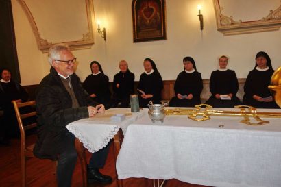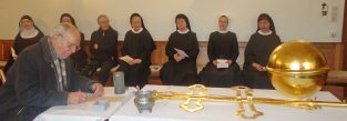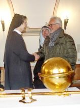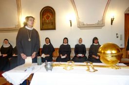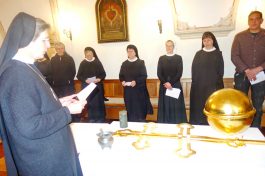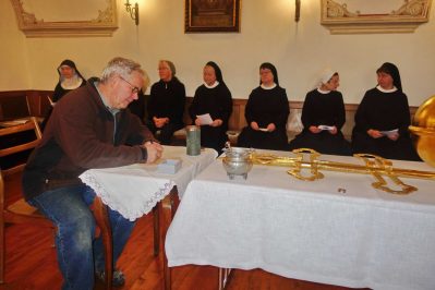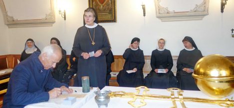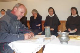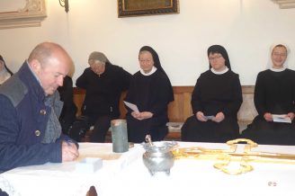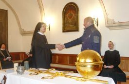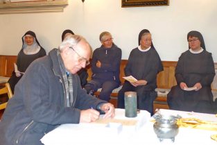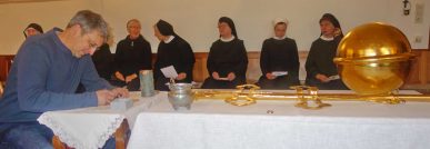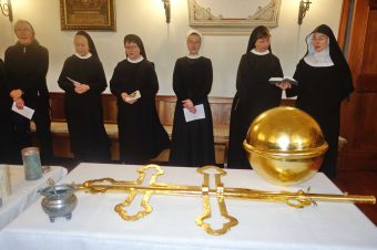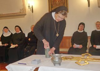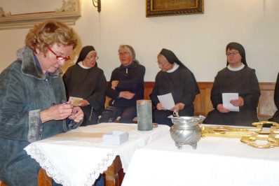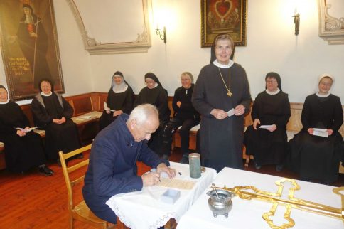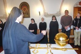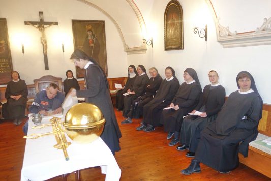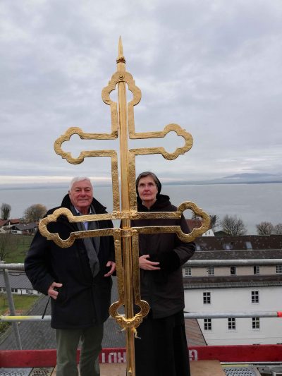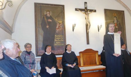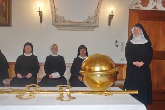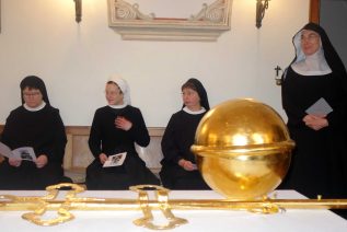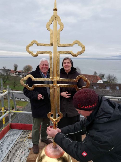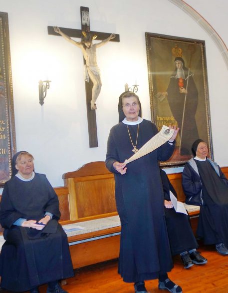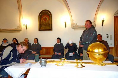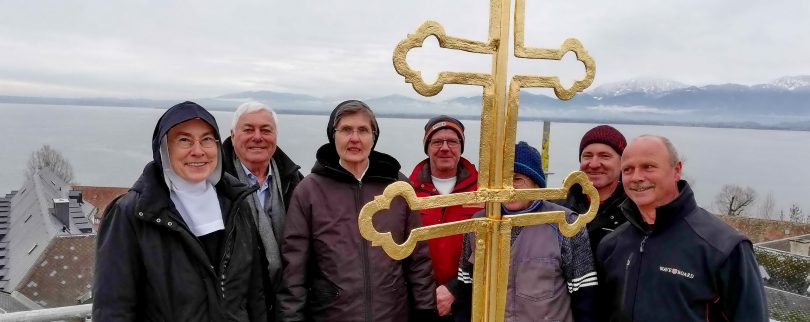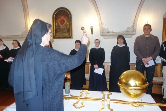 Die Segensfeier begann im Kapitelsaal, der gewöhnlich den Schwestern vorbehalten ist und der der Ort für wichtige Konvent-Entscheidungen ist. Schwester Elisabeth, die sich in den letzten fünf Jahren bei vielen Kloster-Sanierungs-Maßnahmen engagiert und bewährt hat, hieß die Konvent-Mitglieder sowie die Handwerks-Vertreter mit Architekt Helmut Birner aus Unterwössen an der Spitze willkommen. Weitere Gäste waren Pfarrer Konrad Kronast, Insel-Bürgermeister Georg Huber und Josef Austermayer als Vertreter der Bayerischen Schlösser- und Seen-Verwaltung. Nach einem Dank-Lied und einer Lesung stellte Äbtissin Johanna Mayer die Urkunde vor, die in einer Kapsel in die restaurierte Kugel eingefügt wurde. Auf der Urkunde heißt es unter anderem: „Im Jahr 2018 war eine grundlegende Sanierung des Glockentürmchens auf dem Konventgebäude an der Westseite über der Chorkapelle notwendig geworden. Der Glockenstuhl und die Holzkonstruktion des Turmes waren größtenteils verfault oder vom Holzbock zerfressen, das Mauerwerk war brüchig geworden. Herr Architekt Helmut Birner aus Unterwössen wurde mit den Bauarbeiten beauftragt, die in der Zeit vom 24. September bis 14. Dezember durchgeführt wurden. Dabei wurde die Holzkonstruktion wiederhergestellt, ebenso der Oktogonschaft in Holzbauweise wieder aufgebaut, der Helm mit einem Kupferdach verkleidet und die Gesimse von einem Kirchenmaler restauriert. Wir legen dieser Urkunde eine Reliquie der Seligen Irmengard bei. Sie möge unsere Abtei und unsere Gemeinschaft noch viele Jahre beschützen! Ut in omnibus glorificetur Deus (damit in allem Gott verherrlicht werde)“.