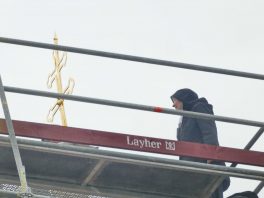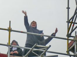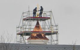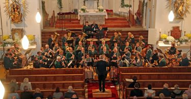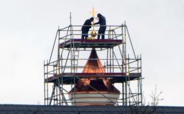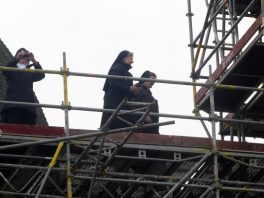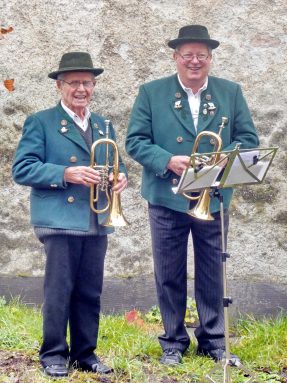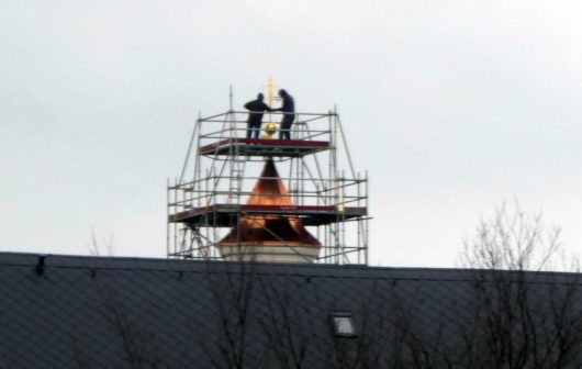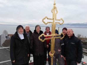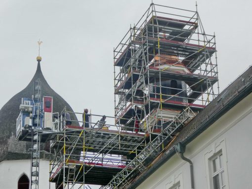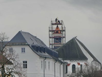 Bei ihrem dankbaren Rückblick sagte Schwester Elisabeth ein herzliches „Vergelt´s Gott“ dem Bayerischen Amt für Denkmalpflege, dem Ingenieurbüro Barthel und Maus aus München, der Priener Baufirma Scheck sowie den Zimmerer-, Dachdecker-, Spengler-, Gerüstbau- und Kirchenmaler-Fachleuten. Ein besonderer Dank galt Reinhard Zehentner von der Landesstelle der Nichtstaatlichen Museen, der sich als Restaurator schon vielfach und hilfreich bei klösterlichen Kulturgütern zur Verfügung gestellt hat. Seit 1994 gibt es einen Freundeskreis zur Unterstützung des Klosters Frauenwörth. Als dessen Vertreter erinnerte Schatzmeister Martin Weichselgartner daran, dass von Anbeginn bis heute rund 1,5 Millionen Euro an Unterstützung für Sanierungsmaßnahmen bereitgestellt werden konnten. „Gemäß unserer Satzung unterstützen wir die baulichen Maßnahmen, alles Geld wurde bisher vernünftig angelegt“ – so Martin Weichselgartner, der in Vertretung für die Vorsitzende Annemarie Biechl an der Feier teilnahm. Zuletzt im heurigen Sommer gab der Beirat des rund 900 Mitglieder starken Fördervereins (www.frauenwoerth.de/freundeskreis/) 45.000 Euro für die Türmchen-Renovierung frei. Aufgrund des maroden Zustands mit einigen Überraschungen im Laufe der Baumaßnahme ist momentan noch nicht sicher, ob die angesetzte Endsumme von rund 135.000 Euro ausreichen wird. Der Segensfeier im Kapitelsaal folgten das Anbringen der Kugel mitsamt der Kapsel mit der alten Urkunde aus dem Jahr 1908 und mit der neuen Urkunde samt einer Irmengardreliquie und das Aufsetzen des Kreuzes. Wie Äbtissin Johanna Mayer noch informierte, ist somit erstmals eine Reliquie der Seligen Irmengard in der Kugel-Kapsel enthalten, da die Seligsprechung erst 1928, also 20 Jahre nach der Fertigstellung des Glockenturmes erfolgte. Musikalisch umrahmt wurden die Segnungsfeier und das Anbringen von Kugel und Kreuz durch die Bläser Helmut Müller aus Pittenhart und Josef Perreiter aus Seeon. Die Baumaßnahme „Glockentürmchen“ wird mit dem Abbau des Gerüsts beendet.
