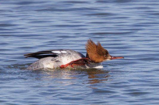 In warmer Winterkleidung, die bei dem seit Wochen vorherrschenden eisigen Ostwind unverzichtbar war, besuchte ich in den letzten Tagen wieder den Beobachtungsturm an der Hirschauer Bucht. Doch wieder war die Bucht wie leergefegt. Keine Blässhühner oder Enten belebten die Wasseroberfläche, ja selbst die sonst allgegenwärtigen Reiher machten sich rar. Nur kurz tauchten Gänsesäger und Schellenten auf und ein Biber zog einsam seine Bahn. Buchfinken, Schwarzmilan und Rohrweihenmännchen sorgten dann doch für Abwechslung.