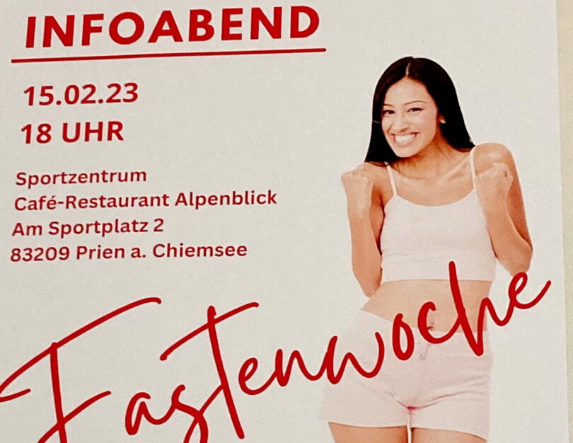 In diesem Jahr lädt der Priener Kneippverein dazu ein bei dessen Fastenwoche mitzumachen, die von der Fastenleiterin Ana Wäsler begleitet wird. Hierfür kann sich bei ihr unter Tel. 0172 1473654 oder unter info@anawaesler.de angemeldet werden. Einen Infoabend zur Fastenwoche gibt es am Mittwoch, den 15. Februar 2023, um 18 Uhr im Café-Restaurant Alpenblick im Priener Sportzentrum.