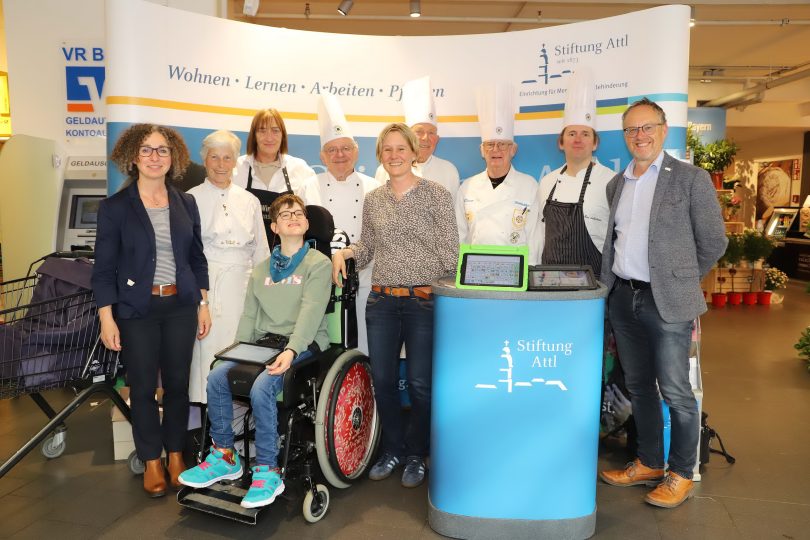 Foto: Hötzelsperger – Spargelschälaktion in Wasserburg zugunsten der Stiftung Attel – v.l. Stellvertretende Marktleiterin Ida Marx, Erika Dumler, Leitung Fachdienst, dem Köche-Quintett Christl Staber, Karl Heinz Kohler, Georg Staber, Bernd Seidel, Vorstand Max Antholzner, Nina Scherer, Fachstelle Unterstützte Kommunikation (Mi.), Franz Hartl, Vorstand Stiftung Attel (re.) und mit Celina Eder im Rolli, Botschafterin Unterstützte Kommunikation.