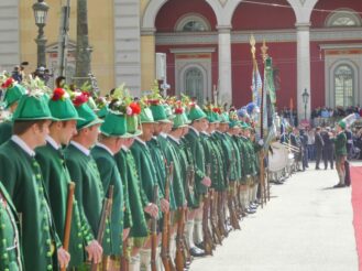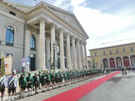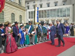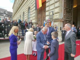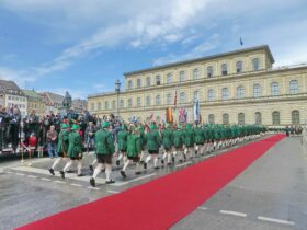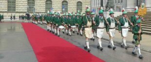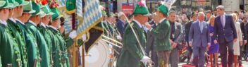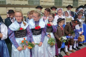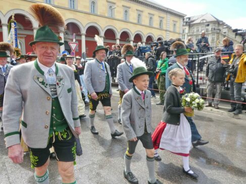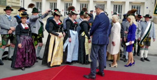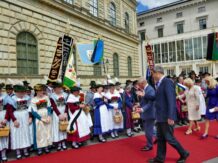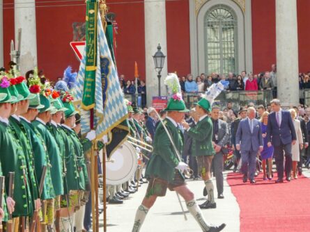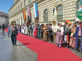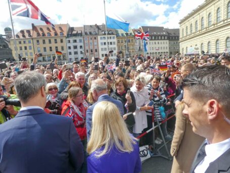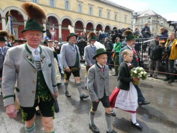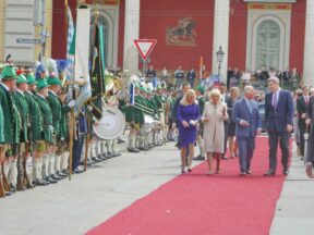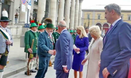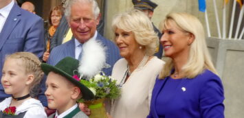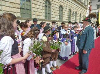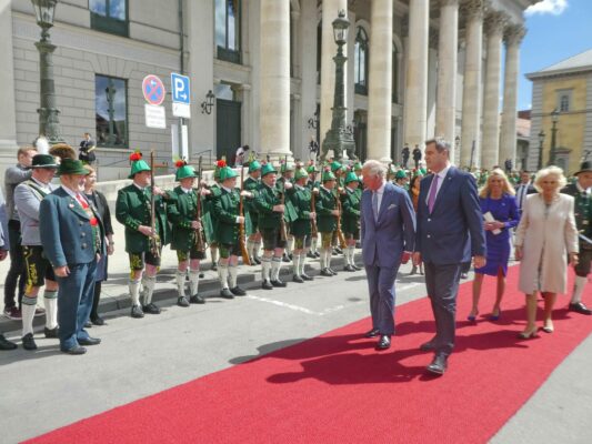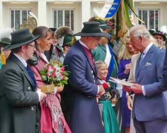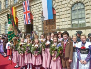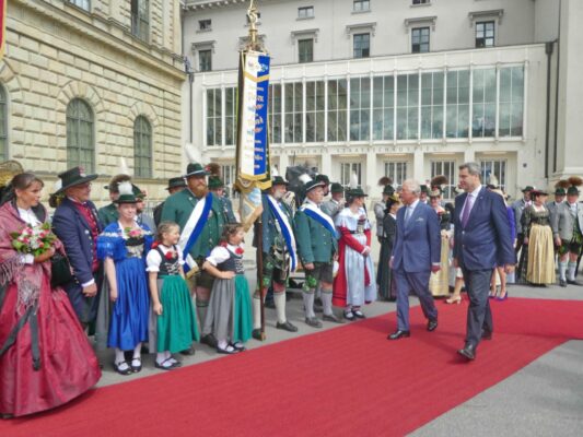 Emmeringer Trachtenkinder und Prinz Charles in München –  München/Emmering – Ein großer Tag war der Empfang der Bayerischen Staatsregierung für den britischen Thronfolger Prinz Charles und seiner Ehefrau Camilla in München für zwei kleine Trachtler aus Oberbayern. Magdalena Lechner und Georg Renner, beide 11 Jahre alt und beide vom Trachtenverein  „Almarausch“ Emmering im Landkreis Ebersberg hatten die Ehre, den hohen Gästen aus England einen weiß-blauen Blumenstrauß namens des Bayerischen Trachtenverbandes zu überreichen. Rund 175 Trachtlerinnen und Trachtler aus den Reihen des Trachtenverbandes und ebenso viele Bayerische Gebirgsschützen präsentierten sich bei weiß-blauem Himmel und in Gegenwart zahlreicher Münchner Zuschauer auf dem Platz vor der Münchner Residenz. Georg und Magdalena waren dabei die Jüngsten. Sichtlich waren sie erfreut und etwas aufgeregt, als Bayerns Ministerpräsident Dr. Markus Söder mit seiner Gattin Karin mit dem royalen Besuch aus England auf sie zukam. „Die Übergabe der Blumen und den höflichen Knicks haben wir vorher ausgemacht“, so Magdalena, die sich ebenso wie ihr Bua über das einzigartige Erlebnis freute. Bei Interviews mit verschiedenen Fernsehsendern sagte Georg auf die Frage, ob er sich Prinz Charles so vorgestellt hat, knapp aber klar: „Ja, genauso wie in der Zeitung!“. Als der ganze Trubel vorbei war, ging es noch zu einer Brotzeit ins Hofbräuhaus. Damit endete ein ganz und gar besonderer, noch dazu schulfreier Tag für das freundliche Trachtenpaar aus den Reihen des Bayerischen Inngau-Trachtenverbandes, das für den Bayerischen Trachtenverband royale Hände schütteln durfte.
